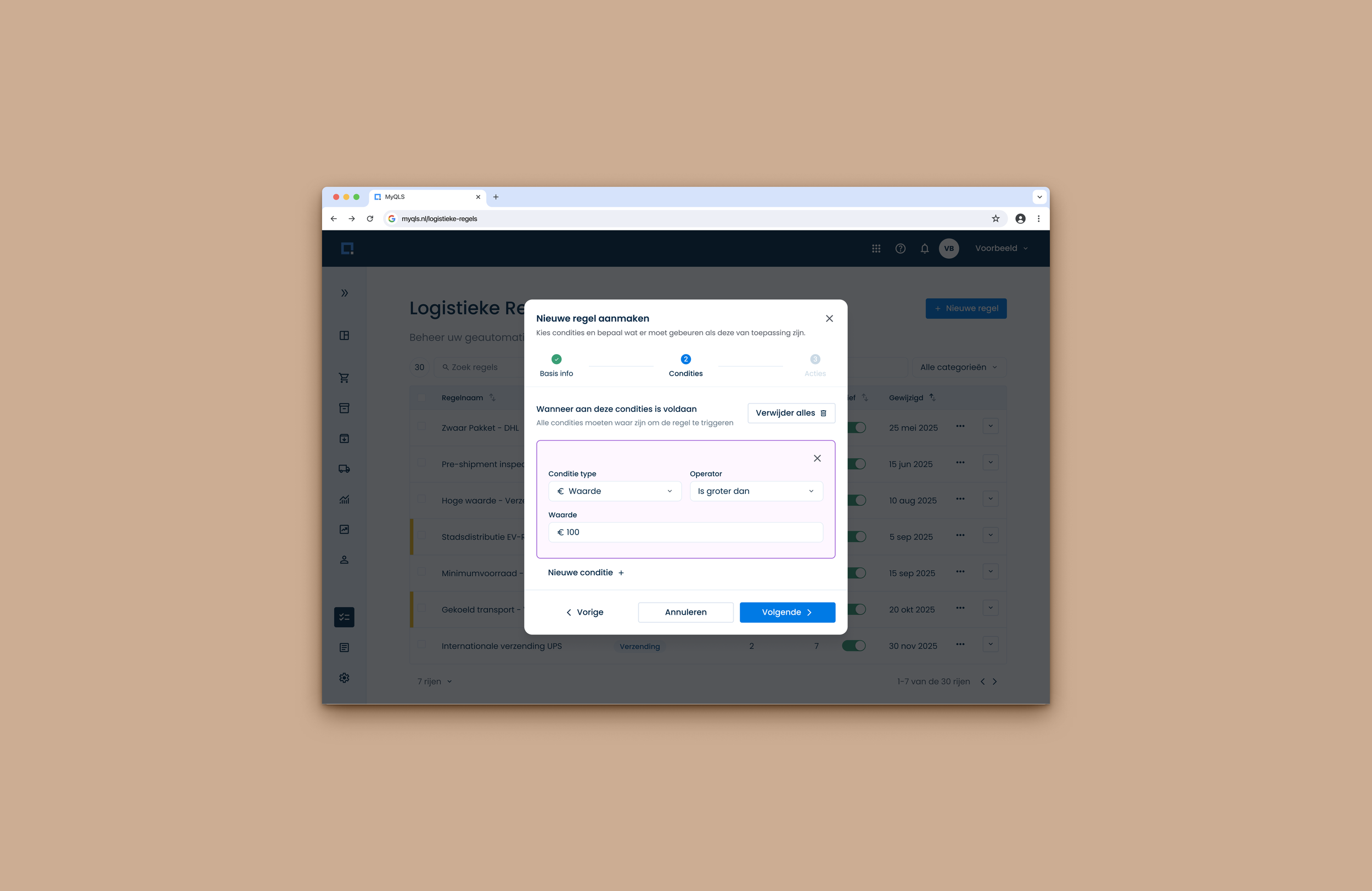 This project was for QLS, a company that offers fulfilment, parcel services, and software solutions in e-commerce (qls.nl). The interface needed to integrate into their ecosystem of warehouse automation and logistics services. Users of QLS, such as webshop owners and operations staff, must be able to define rules that align with the capabilities, constraints, and services that QLS provides, such as multi-carrier options, cut-off times, warehouse actions, and returns.